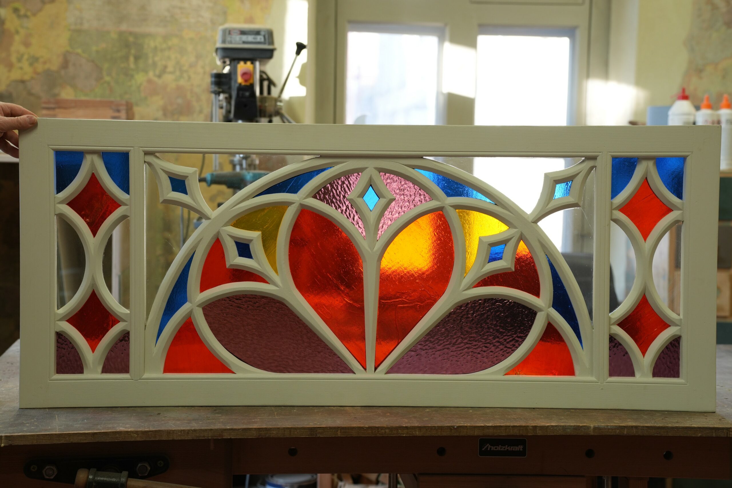 Restaurācijas process bija sarežģīts un laikietilpīgs. Kuldīgas Restaurācijas centra meistars Mihails Sivuhins ir paveicis lielisku darbu. Darba gaitā viņš apguvis jaunas iemaņas rozetes formas kokgriezumu izgatavošanā un apliecinājis izcilu meistarību, atjaunojot zudušo durvju virsgaismas logu. Šobrīd šīs ir pirmās un vienīgās durvis Kuldīgas vecpilsētas ārtelpā ar virsgaismas logu, kurā atjaunots četru krāsu stiklojums ar sarežģītu, ornamentālu augu valsts motīvu.