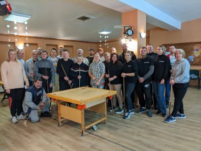 Vīrietis baltā T-kreklā spēlē novusu, tēmējot ar kiju pa melnu ripu uz gaiša galda. Viņam blakus labajā pusē stāv vecāks vīrietis zilā jakā ar rūtainu kreklu, turot kiju un vērojot spēli. Nīkrāces pagasts