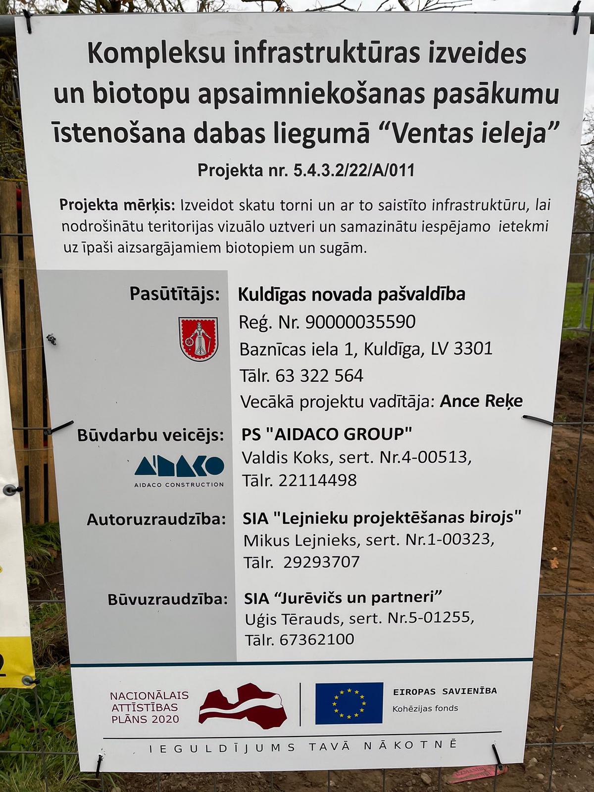 30.08.2022. noslēgts līgums ar PS “AIDACO GROUP” par būvdarbu veikšanu objektā “Skatu tornis ar trošu ceļu pāri Ventas upei Kuldīgā, 1. kārta”, ID Nr. KNP 2022/54-K/ERAF. Līguma izpildes termiņš ir 12 mēnešu laikā no brīža, kad būvniecības ieceres dokumentācijā izdarīta atzīme par būvdarbu uzsākšanas nosacījumu izpildi.